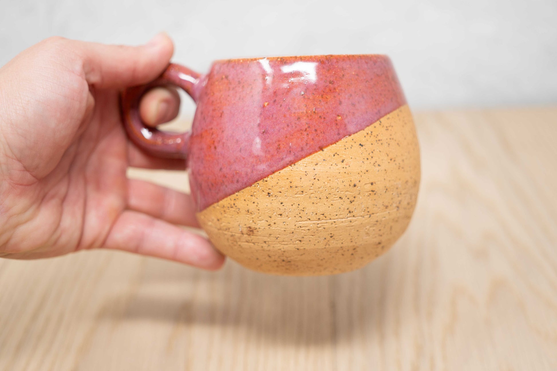 This cozy, hand-thrown mug is designed for comfort and warmth. With a soft, rounded form and an easy-to-hold circular handle, it’s perfect for wrapping your hands around on a slow morning. The pink glazed upper half drapes naturally over the raw, earthy clay base, creating a timeless contrast that celebrates both texture and craft. Holds 12 oz of your favorite coffee, tea, or hot chocolate—your new everyday companion.