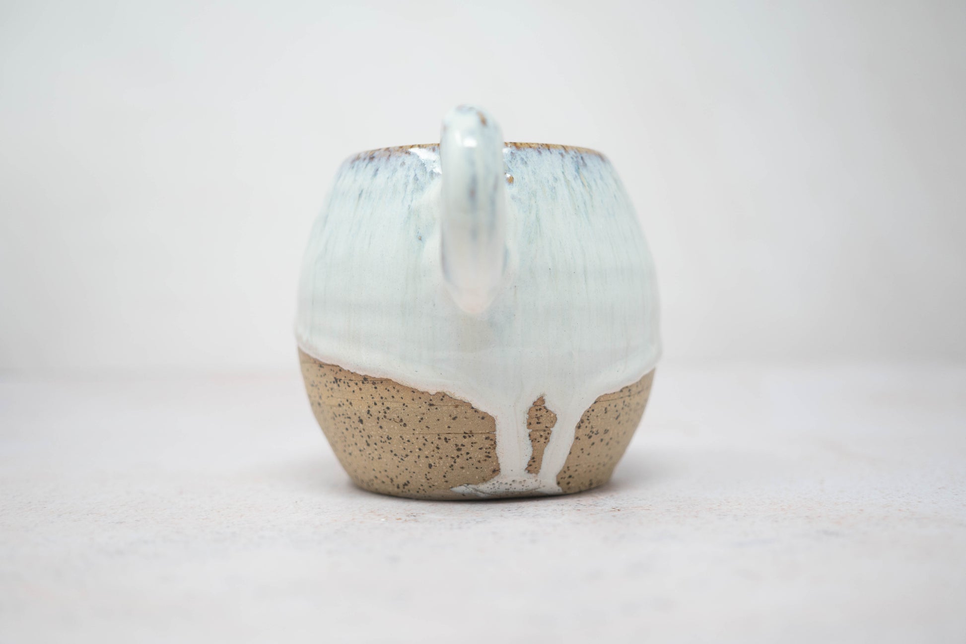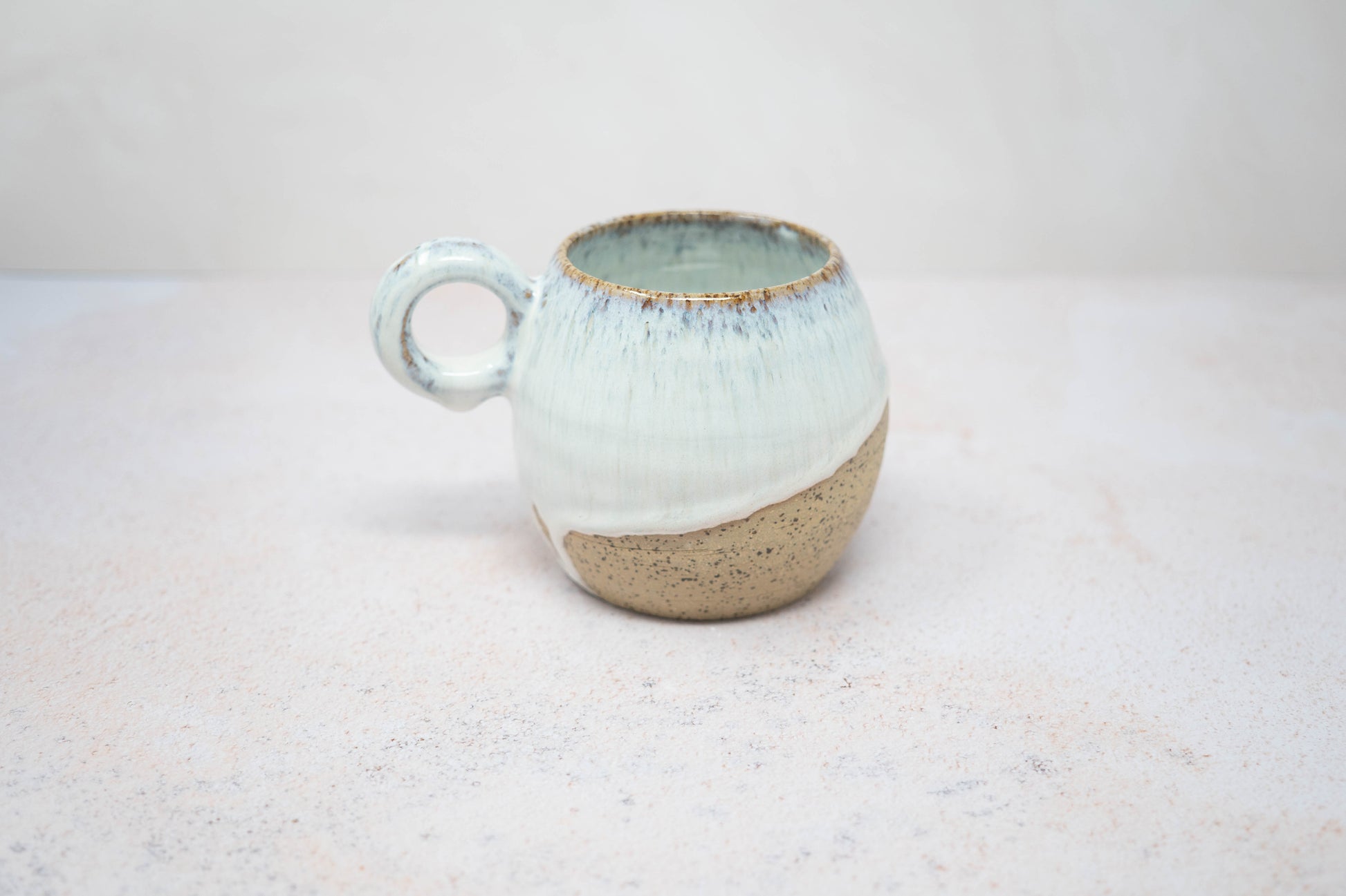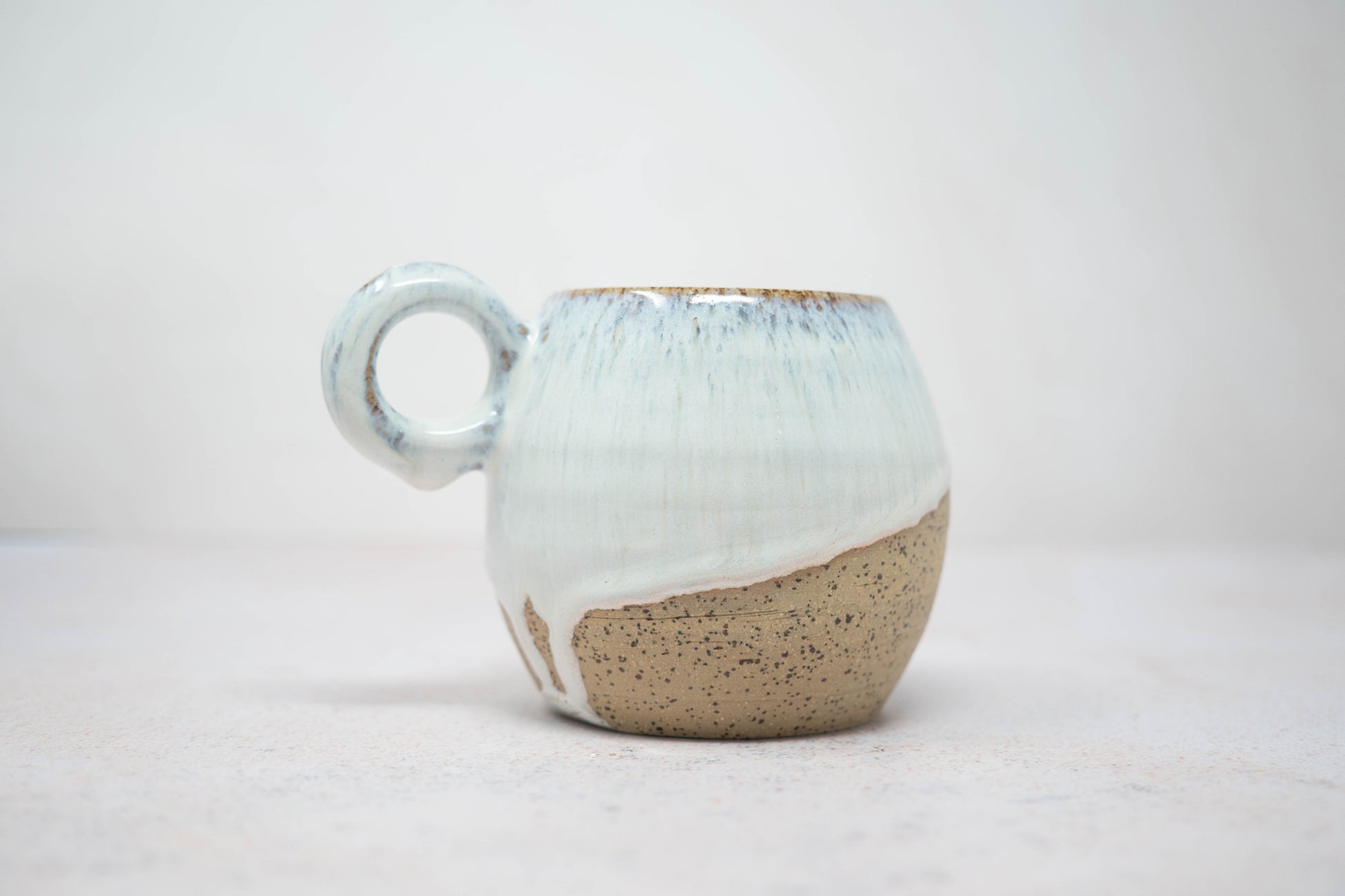 This cozy, hand-thrown mug is designed for comfort and warmth. With a soft, rounded form and an easy-to-hold circular handle, it’s perfect for wrapping your hands around on a slow morning. The white glazed upper half drapes naturally over the raw, earthy clay base, creating a timeless contrast that celebrates both texture and craft. Holds 12 oz of your favorite coffee, tea, or hot chocolate—your new everyday companion.